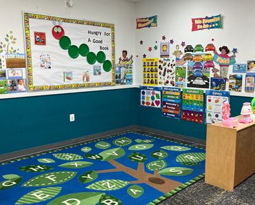 Our daycare center toddler classroom engages children with early language development using an interactive reading system that introduces the whole language approach. The "Your Baby Can Read" system uses combinations of sight and sound to learn naturally, with fun-filled activities
